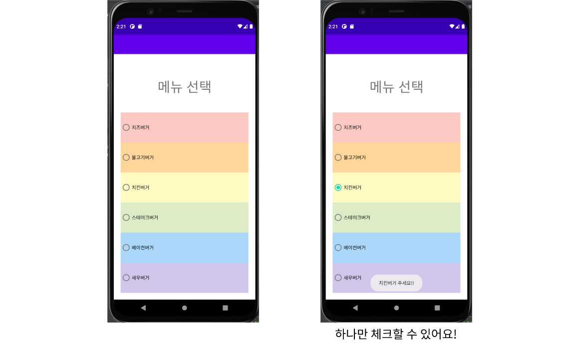 무조건 한개만 선택 가능한 RadioButton 을 써보겠습니다!!!