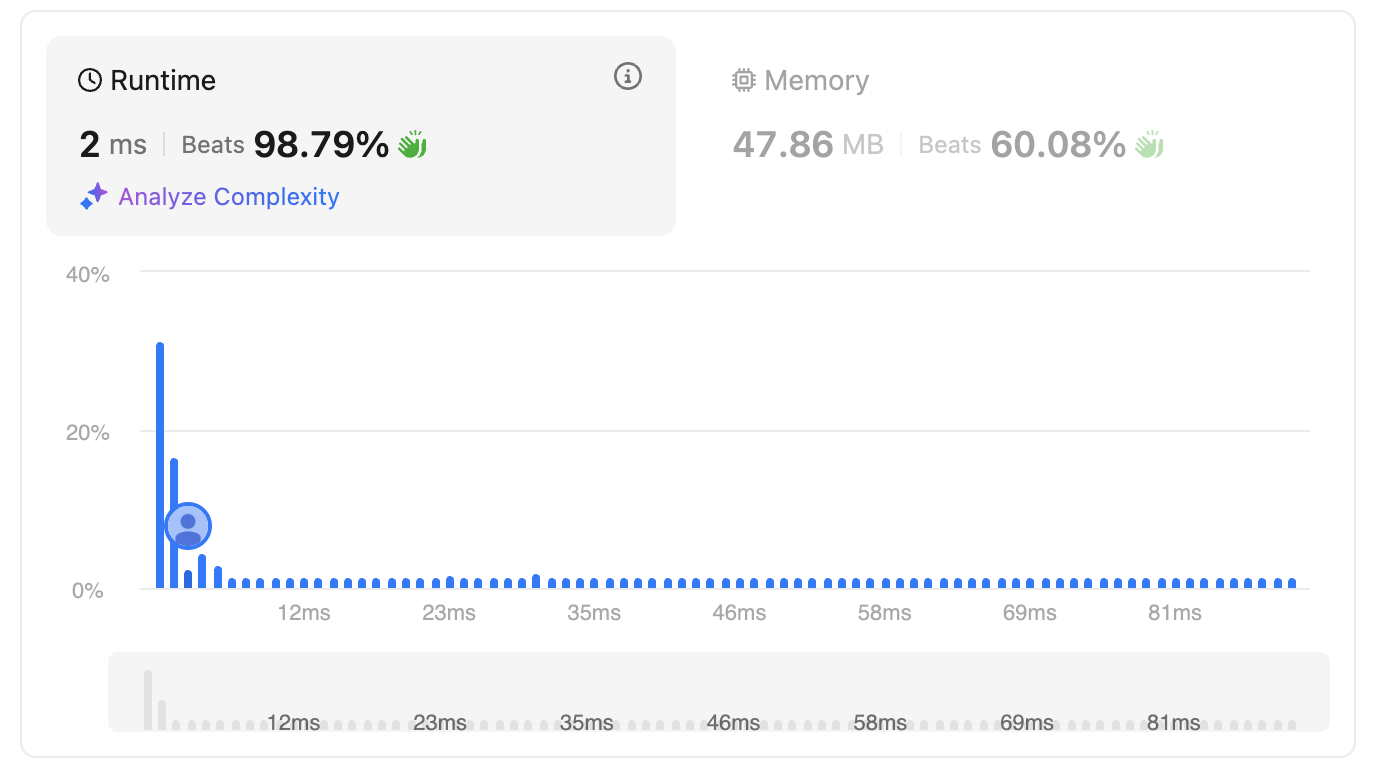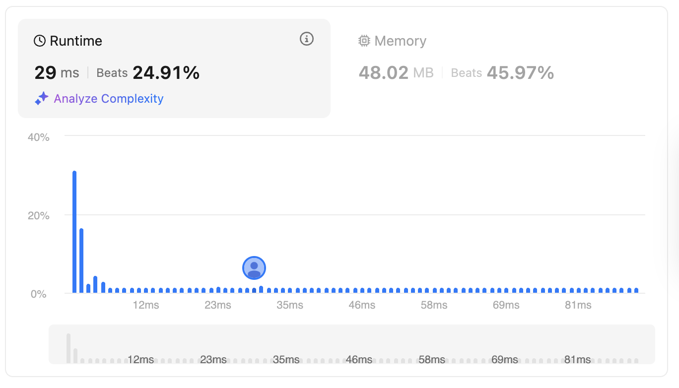 모든 테스트 케이스가 다 통과 되었지만, Runtime 시간은 29ms 로 좋은 코드는 아닌 것 같다.