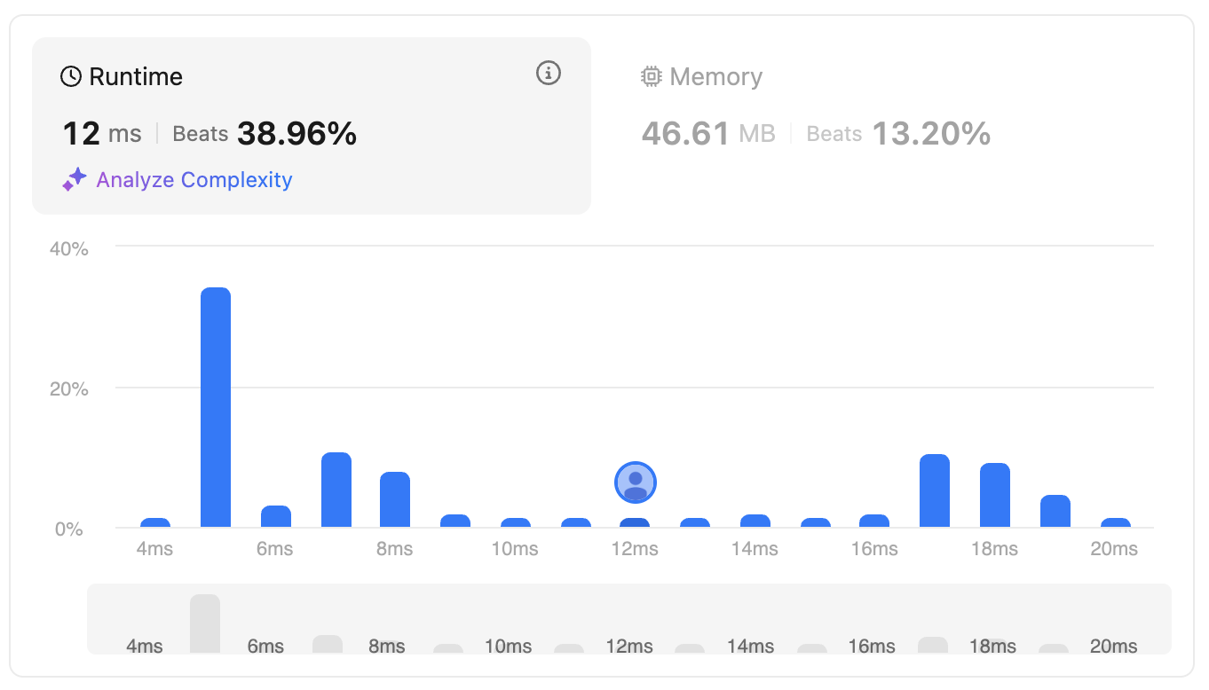 테스트 케이스는 다 통과 됬지만, 역시나 Runtime 은 12ms 로 좋은 코드가 아닌 것 같다.